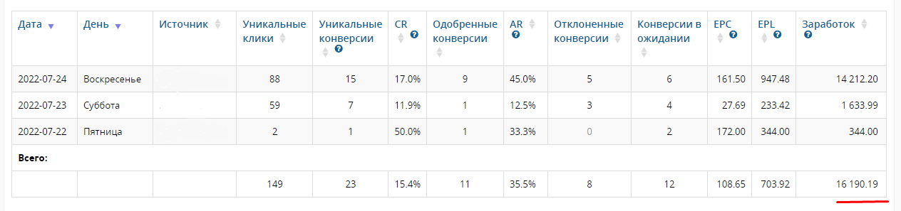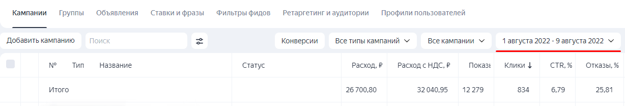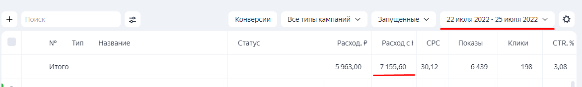 Расход в Яндекс Директе 7 155.60 рублей, доход в Лидс за этот период 16 190.19 рублей.