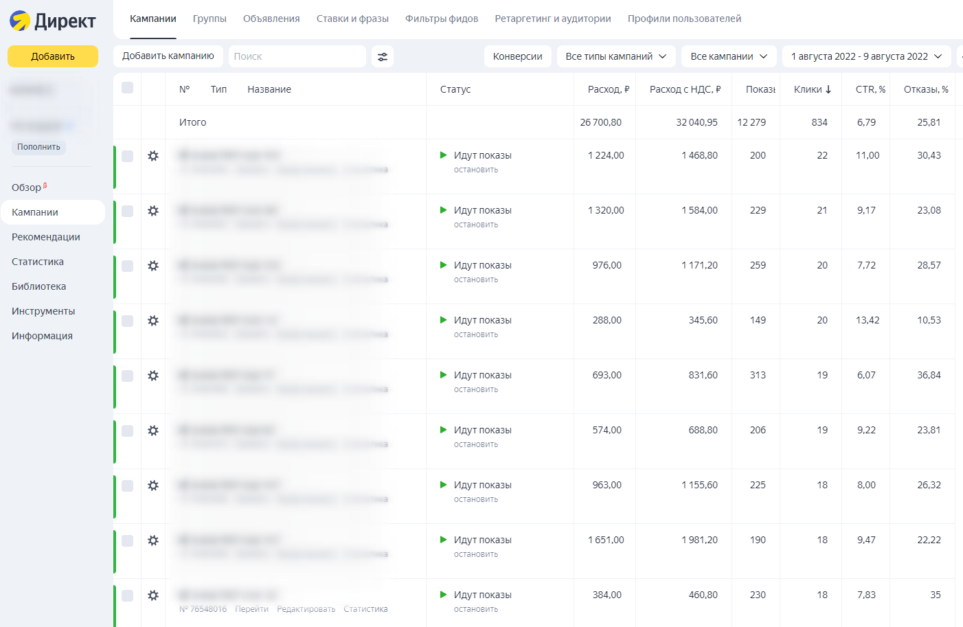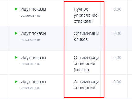 Кампании были разделены на Поиск и РСЯ и внутри распределены по различным стратегиям.